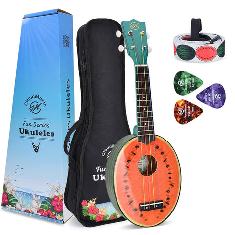 - CloudMusic’s watermelon soprano ukulele kit comes with a ukulele strap with hook, Hawaiian style printed gig bag, ukulele picks.